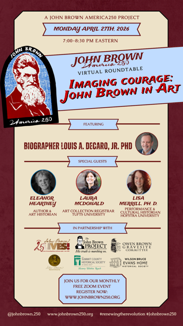 John Brown: America250 is hosting a free virtual roundtable discussing the intersection of 19th-century portraiture and modern archival preservation. Host Louis A. Decaro Jr., Ph.D., will be joined by Eleanor Heartney, Laura McDonald, and Lisa Merrill, Ph.D. To learn more about the John Brown: America250 coalition and register for this event, click here or visit johnbrown250.org.