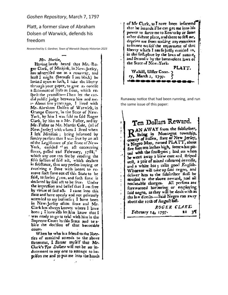 Combing through newspapers from the late 1700s and early 1800s reveals many ads from enslavers searching for runaway slaves, but not many responses from those who self-emancipated. This case, researched by Sue Gardner, Local History Librarian and Town of Warwick Historian, reveals an exception to the imbalance in historical perspectives that we find ourselves faced with as historians and learners in the present day. On March 7, 1797, a self-emancipated man named Platt wrote a lengthy letter in the Goshen Repository [1]. His letter was a direct response to a runaway ad published by the Goshen Repository on February 14 of the same year by Roger Clark, Platt’s former enslaver. While runaway ads were common, Platt’s public response was a rare occurrence. In addition, the publication of this response by a local newspaper was a notable move by the publisher. Today, his story serves as an opportunity to learn about the ways in which formerly enslaved people argued for their own rights and exercised personal agency against the brutal system of slavery. It also suggests the need for a deeper conversation on the complicated journey that led to abolition in New York State.